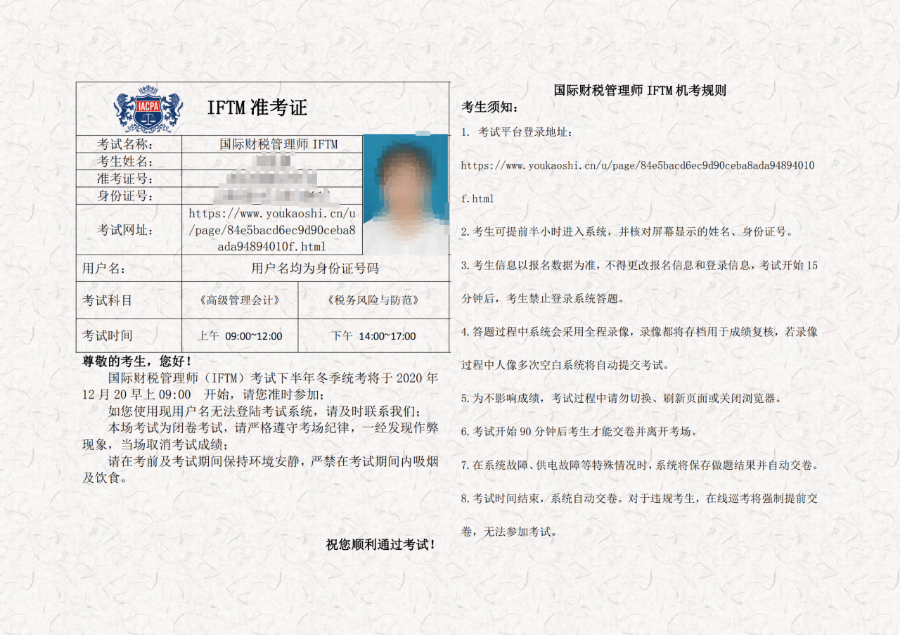 欢迎您参加由国际注册职业会计师协会(IACPA)中国代表处组织的“国际财税管理师IFTM”考试!本次考试采用线上考试机制,按照财税岗位的核心技能,培养新时代具有国际视野、符合中国国情的国际高端会计人才。